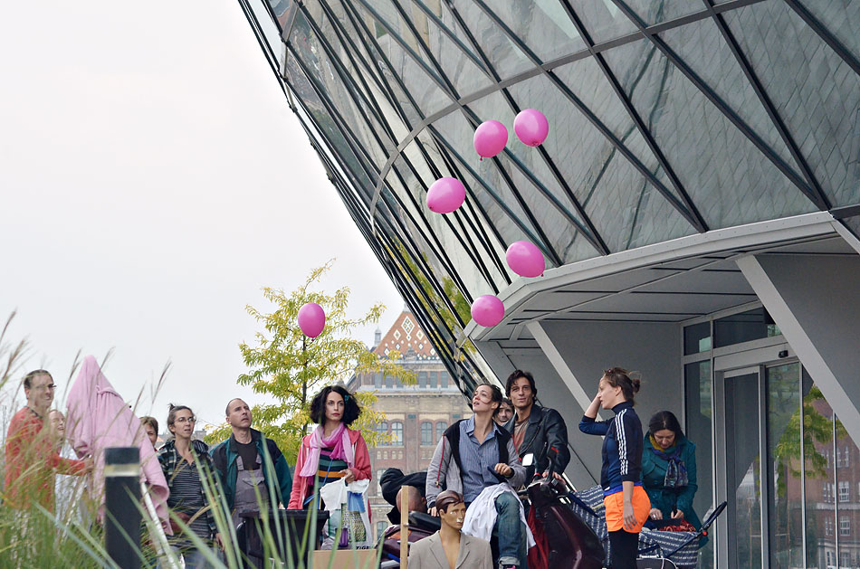 Ki színész, ki statiszta, ki valódi járókelő? Mi valóság és mi van megrendezve? Természetesen minden karakter beazonosítható már az első vagy a második megjelenésre, hisz jelenlétüket mindig egy hangsúlyos, zavarbaejtő, feszült vagy törékeny momentum kíséri. Ennek ellenére a néző játékos hangulatba kerül, és azt is szereplőnek akarja látni, aki nem az. Bár a budapesti és az albuquerque-i változatban minden előadásban részt vettek statiszták is a nagyobb elbizonytalanítási faktor kedvéért, azért az pl. sejthető a néző számára, mikor egy 15 fős óvodás csoport megjelenik, hogy ők nem a történet részei. Mégis úgy nézik őket.