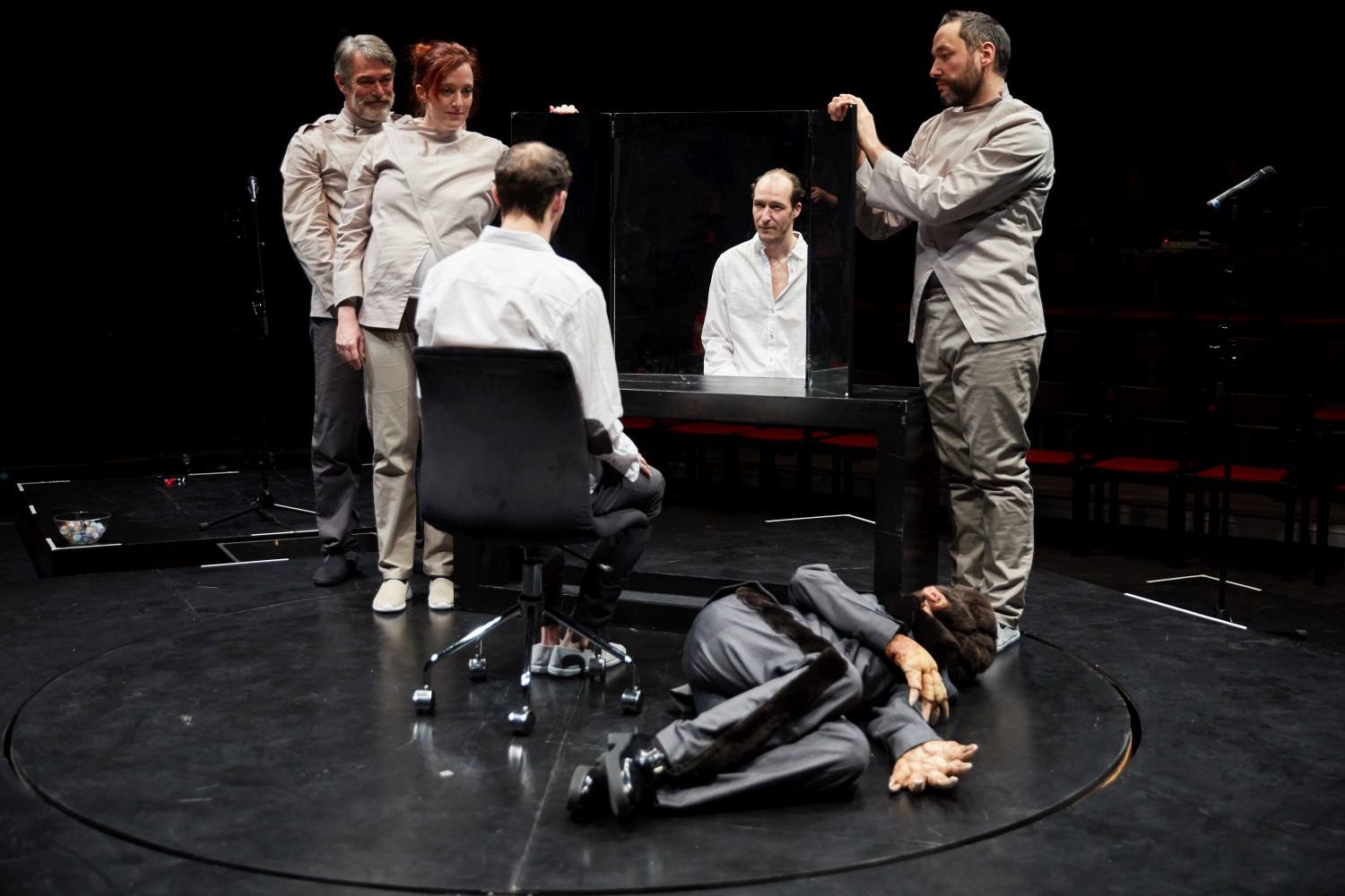 Boross Martin: Rendhagyó a térhasználat is. A nézők szektorokban ülik körbe a forgószínpadot. Így ők maguk zárják be ezt a kört. A darabban általában minden egy ilyen körmotívumra épül. A kör egyszerre meg is véd, de be is zár.